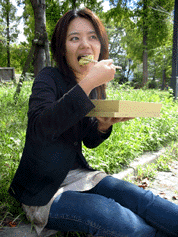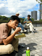 お弁当を水辺で幸せそうに食べる人(写真:中)